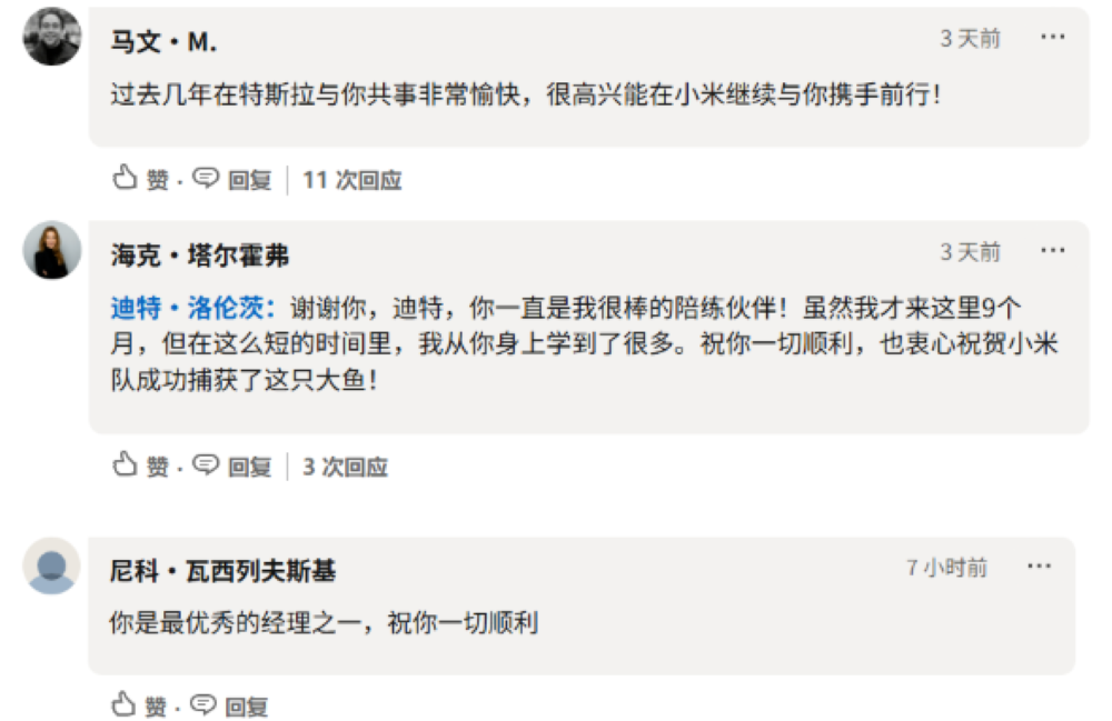 该帖子收到了数十条评论,其中包括特斯拉前同事的留言,值得注意的是,另一位特斯拉欧洲前运营员工马文·M(Marvin M.)似乎也已加入小米,马文评论称他们将在新公司继续共事。