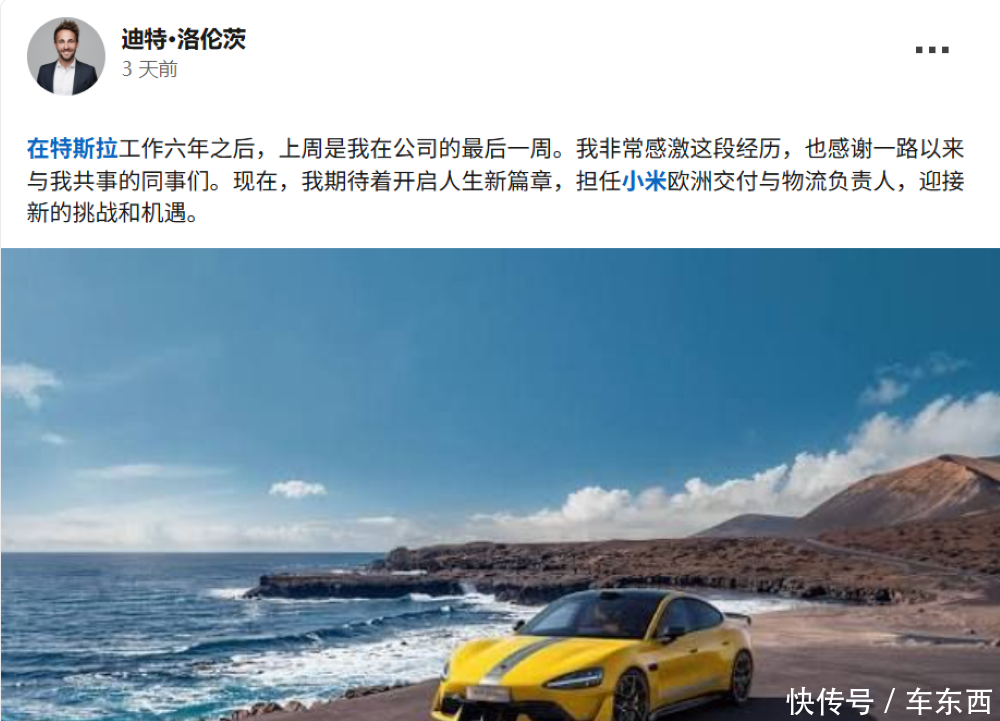 洛伦茨在宣布离开特斯拉的领英(LinkedIn,职业社交网络平台)帖子中写道,他现在“期待在小米科技开启新的篇章,担任欧洲交付与物流负责人,迎接新的挑战和机遇”。